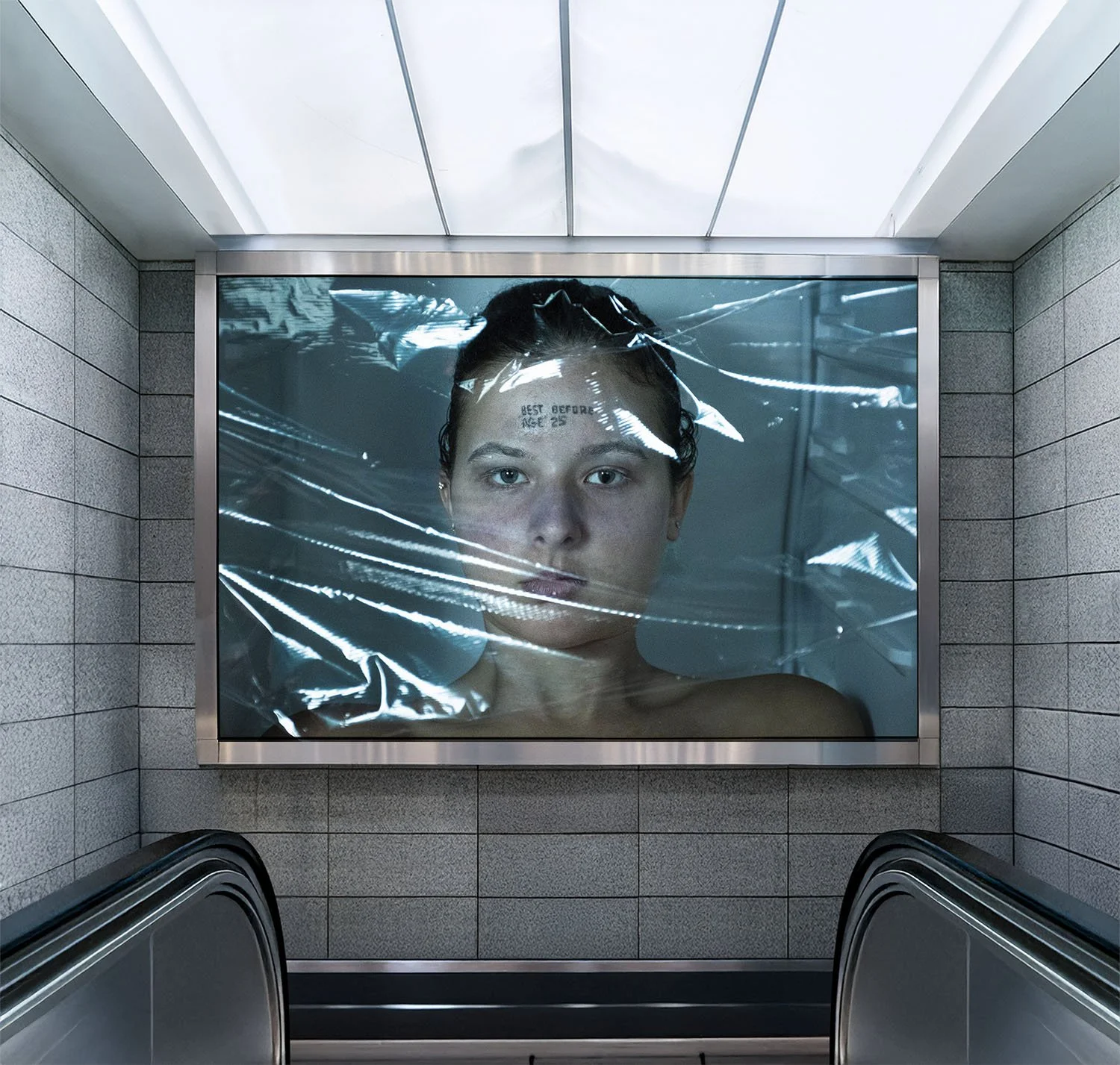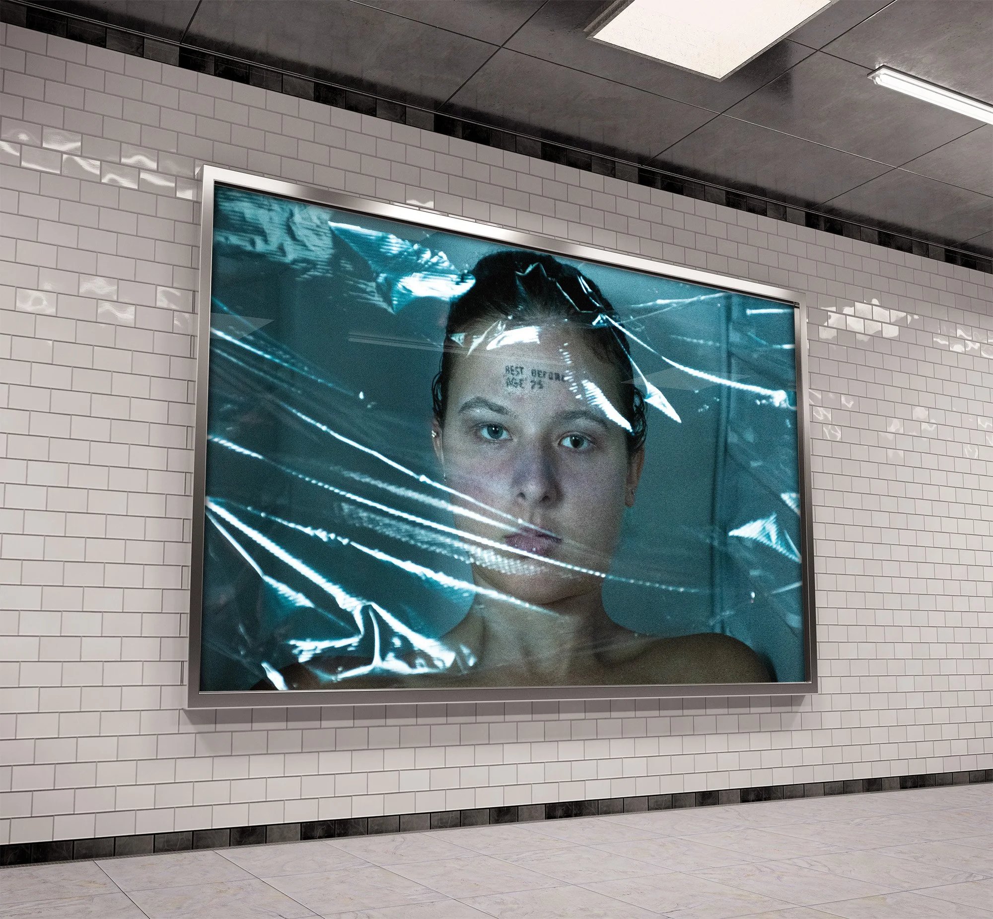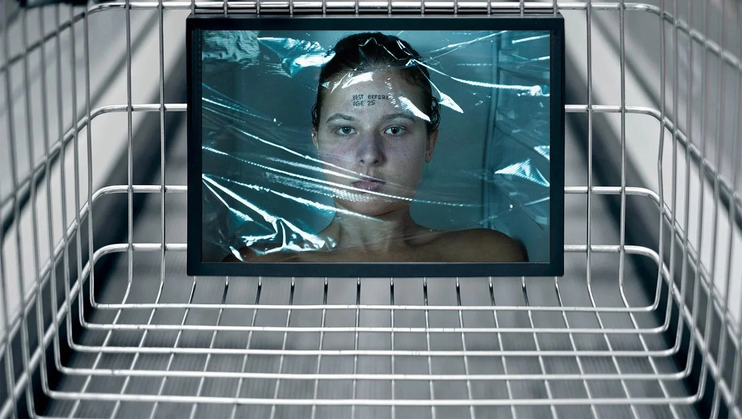 A photographed metaphorical portrait, created as an experimental image confronting society’s pressure on women to resist aging. The model appears frozen like food in a freezer and marked with an expiration stamp, critiquing the obsession with youth and inviting viewers to reflect on the harmful expectations placed on women.