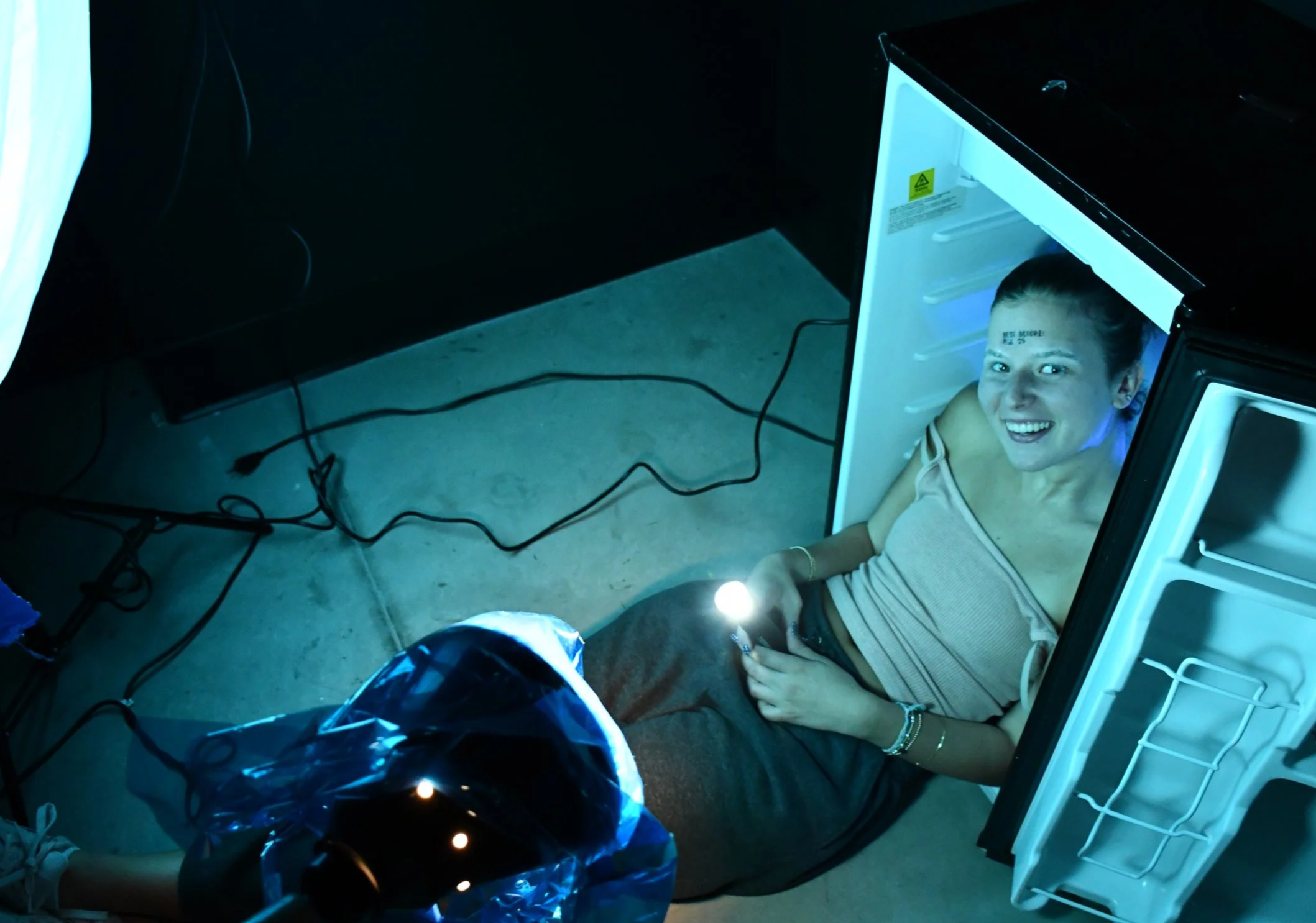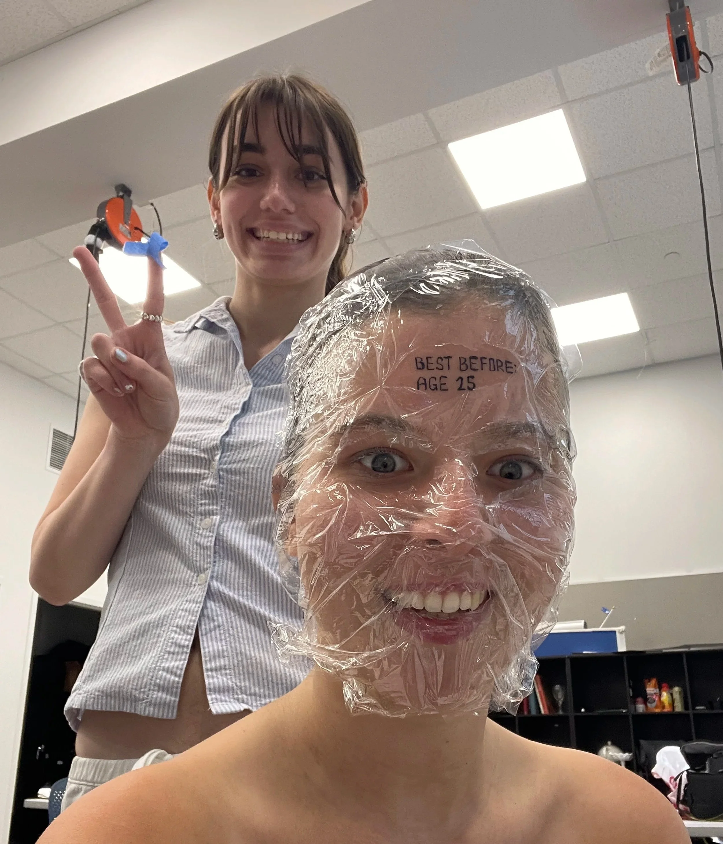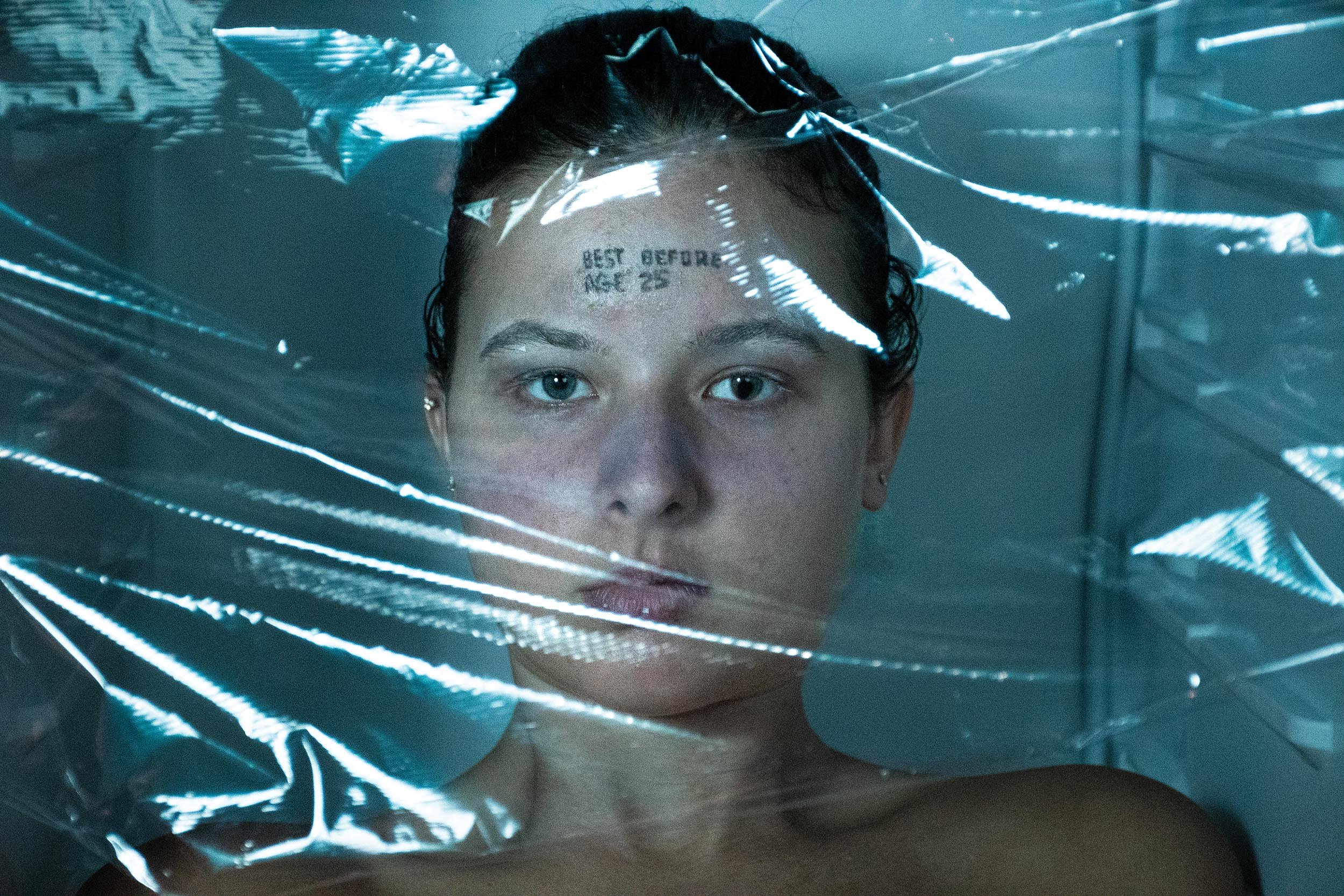 To develop my concept, I began experimenting with a blank wall to capture a frozen, lifeless look. As the idea evolved, I explored ways to make the set feel more like a freezer, gathering inspiration from food packaging and preservation visuals. I tested props like plastic wrap, experimented with frosty makeup, and directed the model’s intense stare to convey forced preservation. Cool-toned, dramatic lighting helped create a clinical, refrigerated effect, while the “Best Before 25” stamp tied the concept to societal pressures on women to remain youthful.