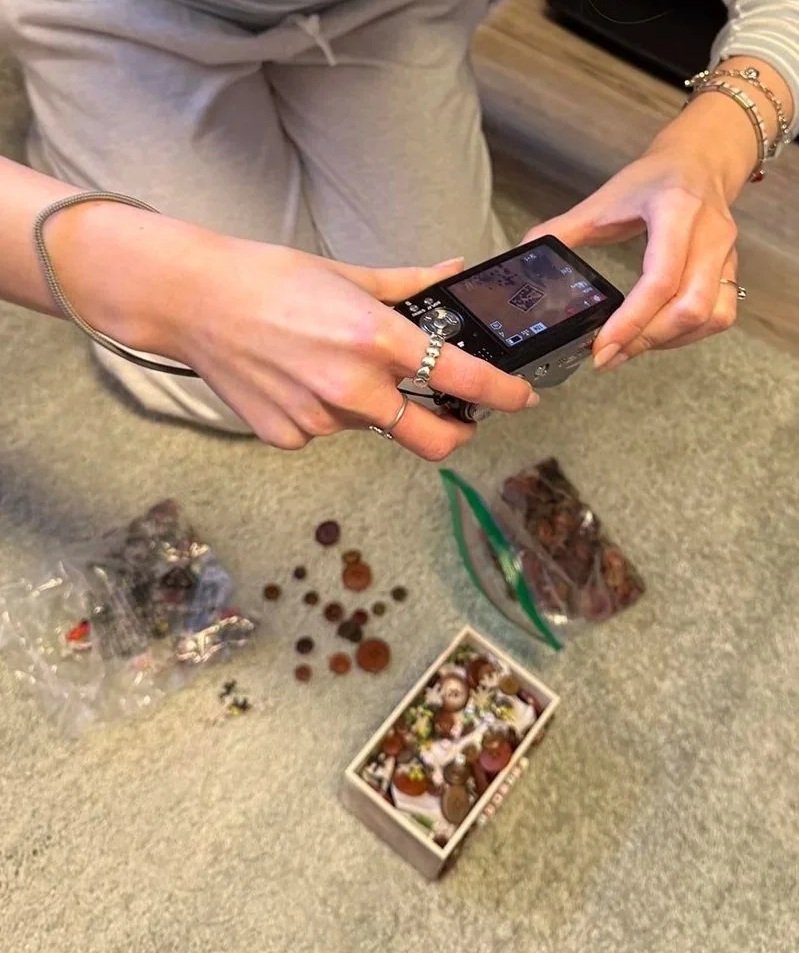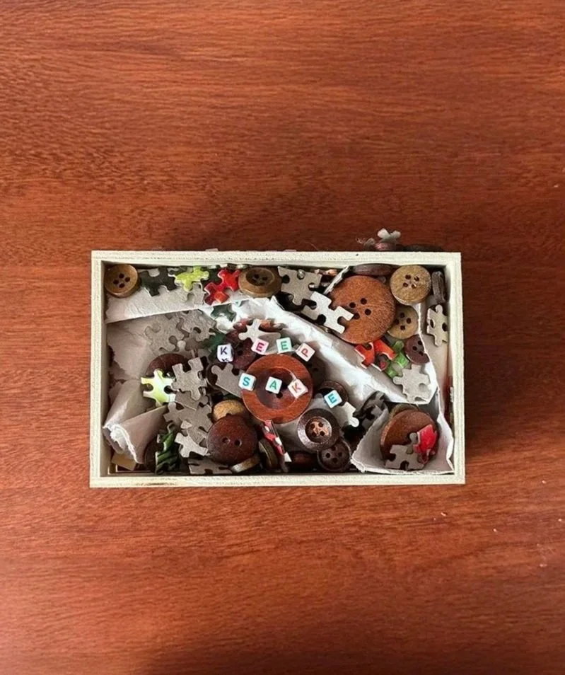 I began by selecting 10 tracks from the artist with themes of growth and change, which guided the concept for the repackaged album. I explored visual approaches to nostalgia through textures, materials, and vintage-camera experiments. Through moodboards and sketches, I developed a wooden box structure using puzzle pieces, buttons, and crumpled newsprint as fragments of childhood.