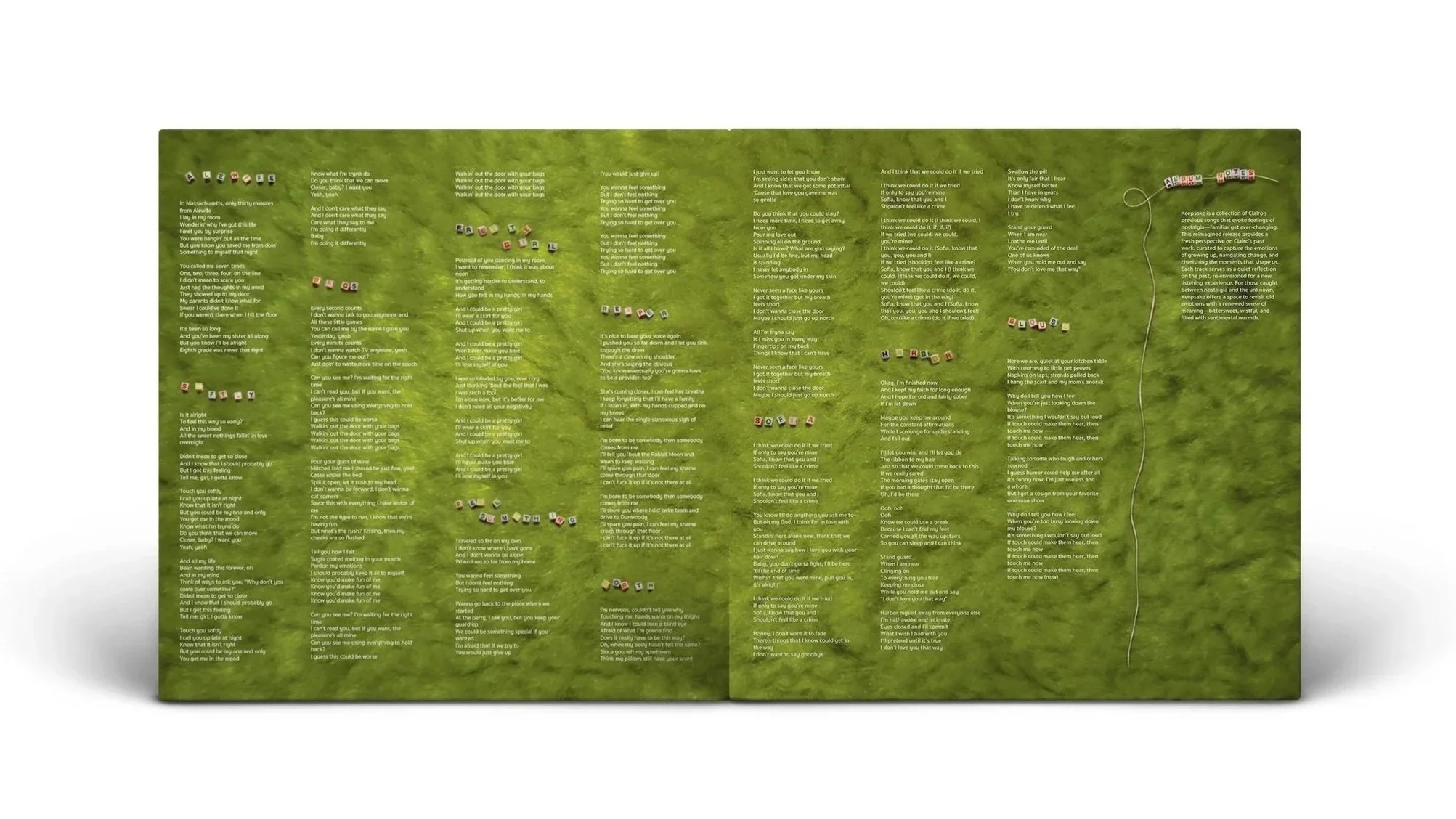 Keepsake is a nostalgic vinyl package that reimagines Clairo’s songs into a new album, reflecting childhood, growth, and change. Designed for young adults navigating emotional transitions, the project invites listeners to revisit the past through tactile, intimate materials—puzzle pieces, letter beads, paper, and fuzzy textures—creating a sentimental, tangible connection.