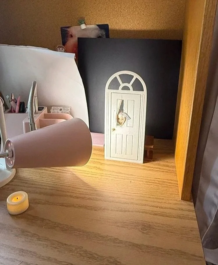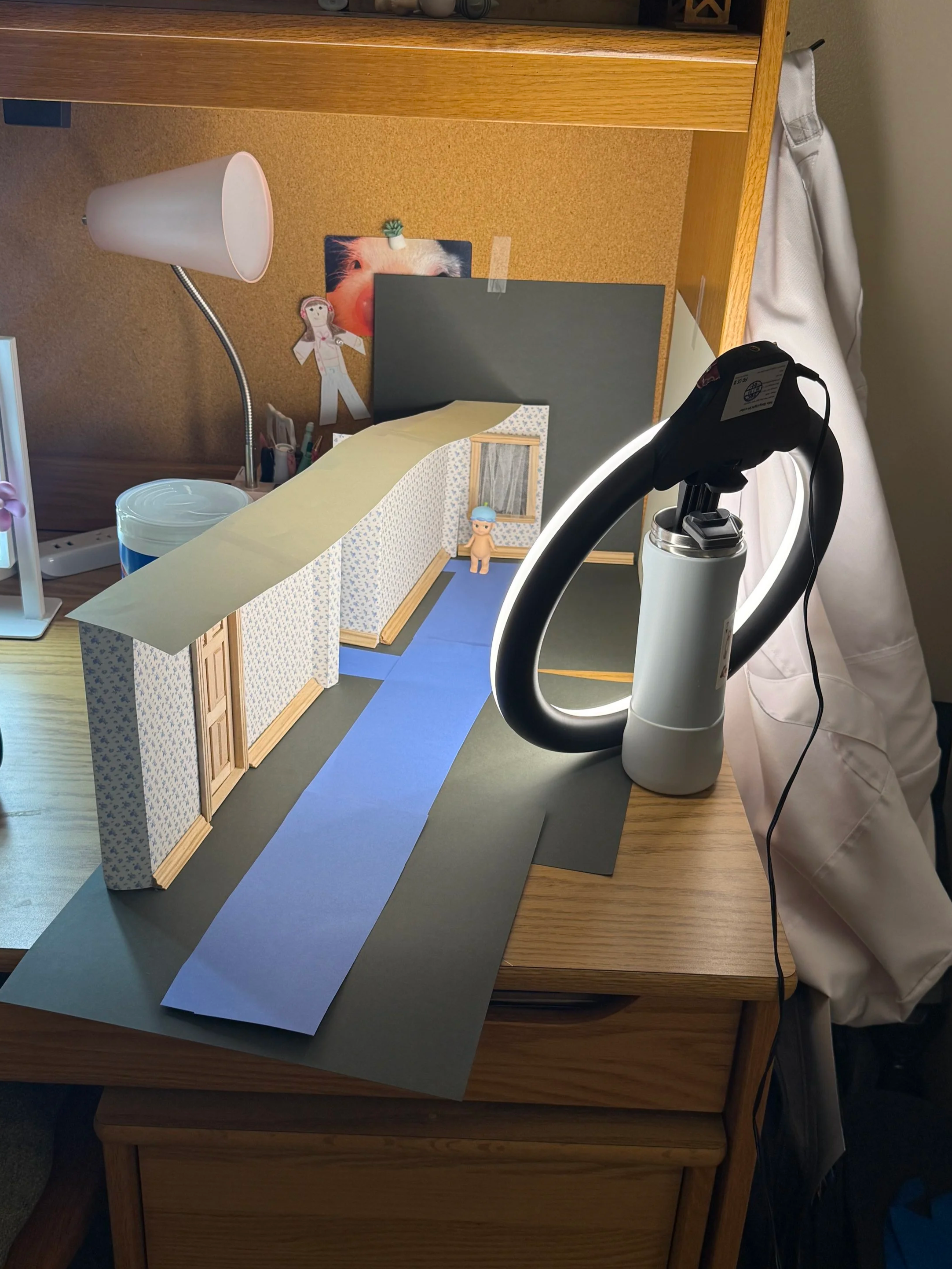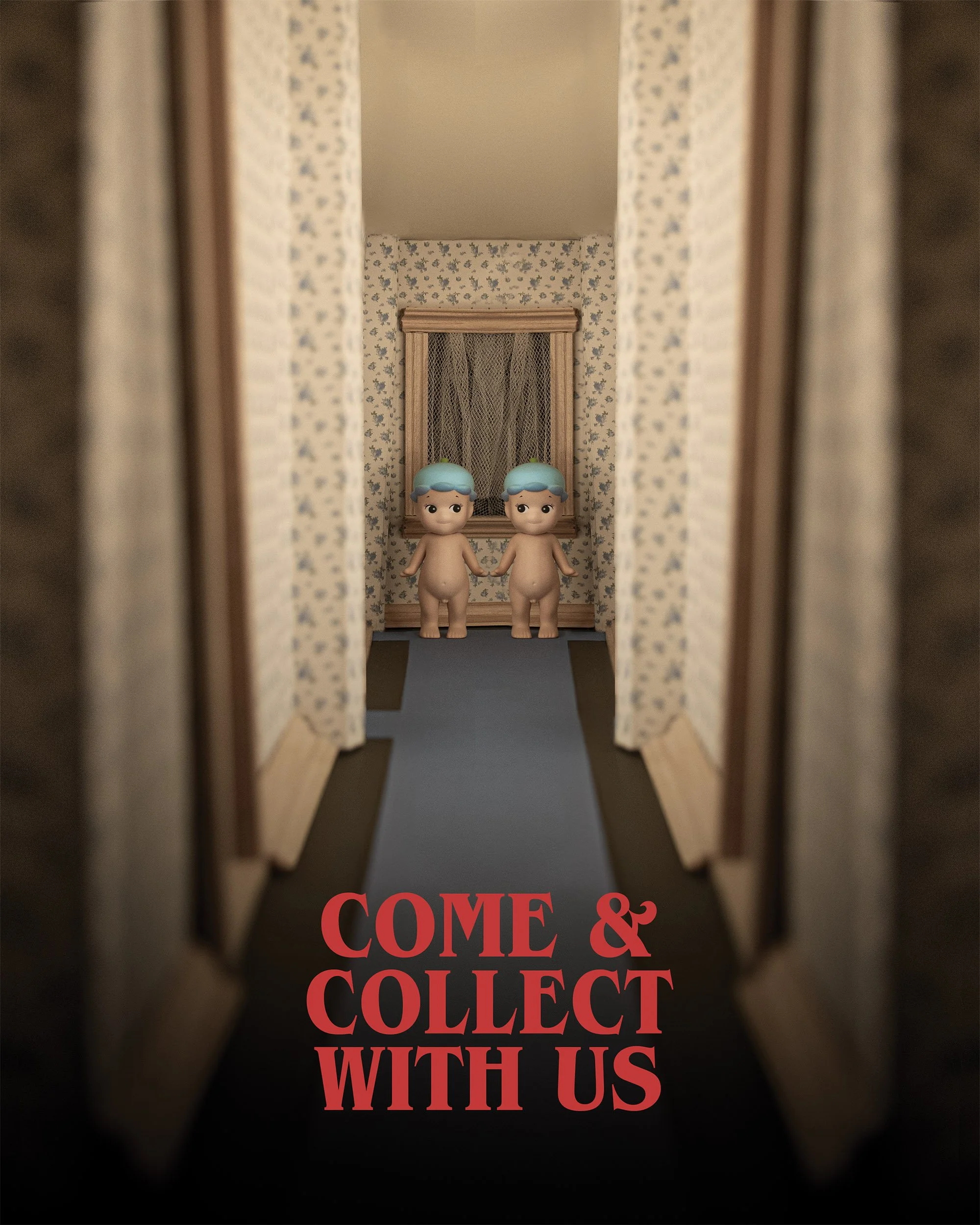 Working at such a small scale was challenging, requiring the scenes to feel realistic while keeping references legible. For efficiency, I built half of the set for the hallway image and mirrored it in post to create the full space. Refining the details, experimenting with materials, poses, and wordplay, and using dramatic lighting with harsh shadows, I established this creepy yet playful tone.