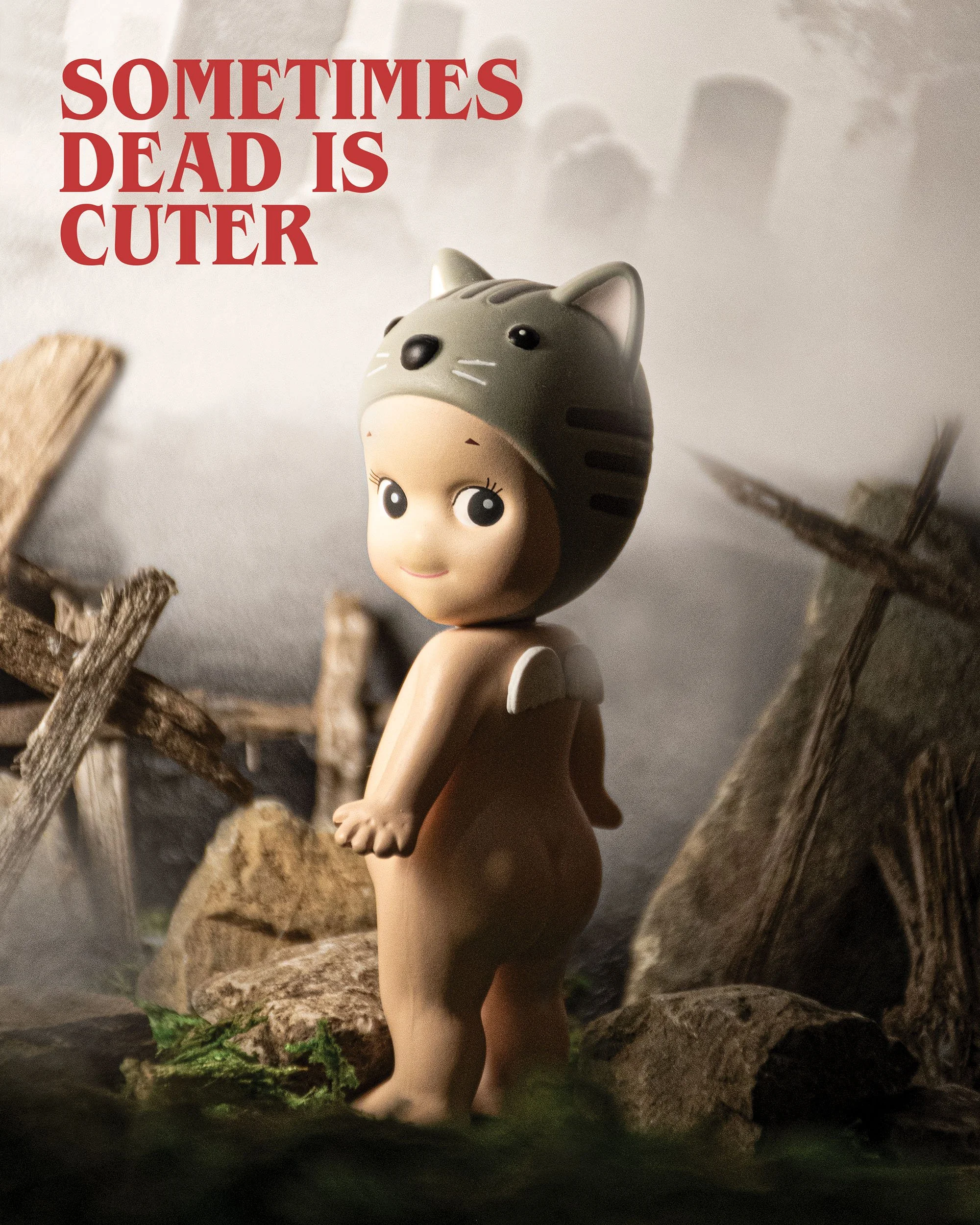 After conducting brand research and analysis, I established my audience by finding connection between collectors and horror fans. I then developed mood boards, sketches, and digital drafts. To bring the campaign to life, I built miniature sets using found objects—trash, sticks, and rocks—along with custom wallpaper and printed backdrops for the three-inch figures.