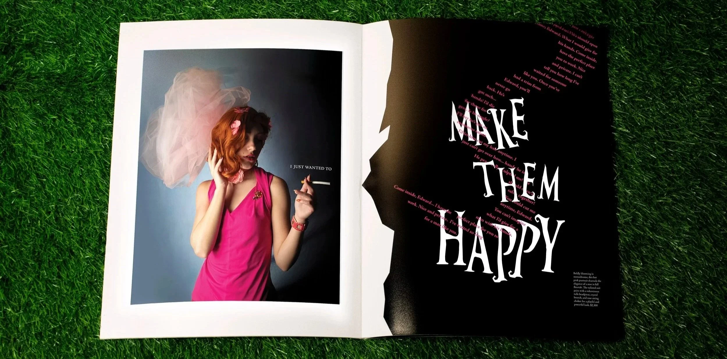 Coordinating with models, setting up the sets, and designing the wardrobe presented challenges, including scheduling conflicts and limited time. Despite this, I refined my concept through each medium: set design, styling, photography, lighting, retouching, and typography. The final outcome is a hand-crafted magazine that brings these elements together into a cohesive narrative.