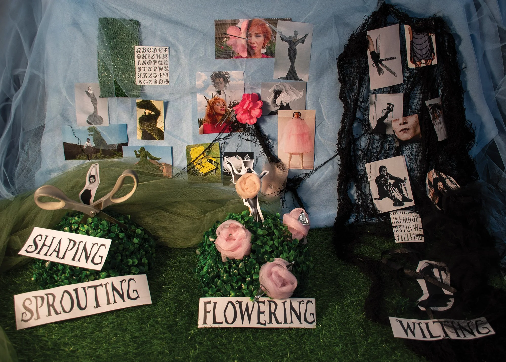 To develop the concept, I built the spreads around an organic, plant-life metaphor—sprout, bloom, and wilt—so the imagery, poses, outfits, and typographic treatments would reflect Edward’s emotional and psychological transformation throughout the magazine. I began by creating a physical mood board to define the narrative and tone of the magazine, collecting colors, textures, and symbols.